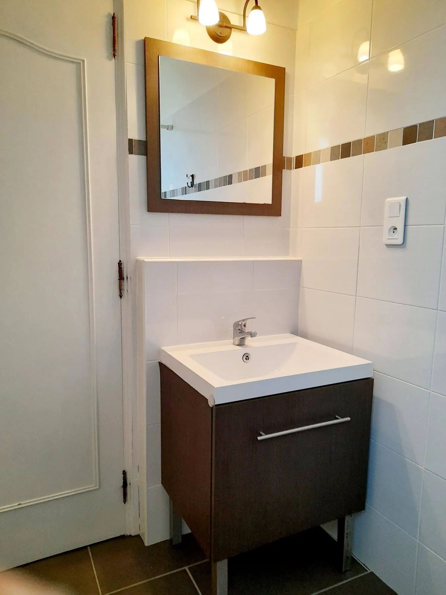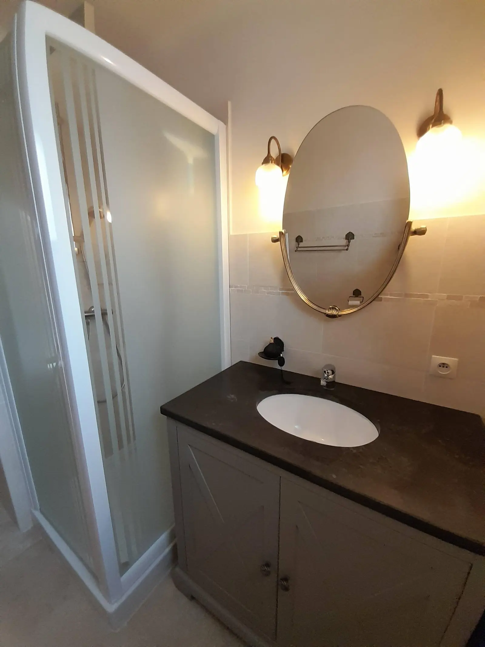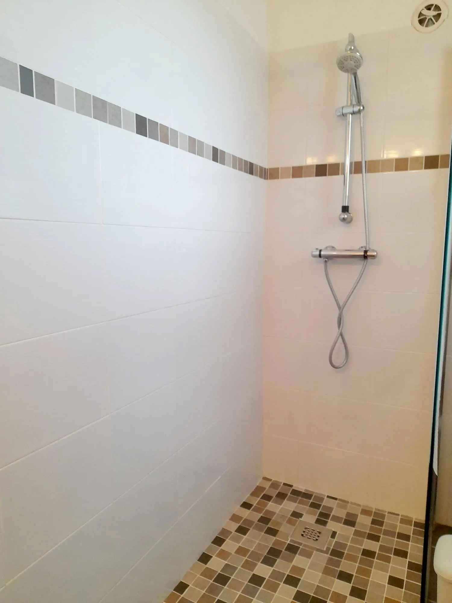 Badezimmer mit Waschbecken, Dusche und Toilette