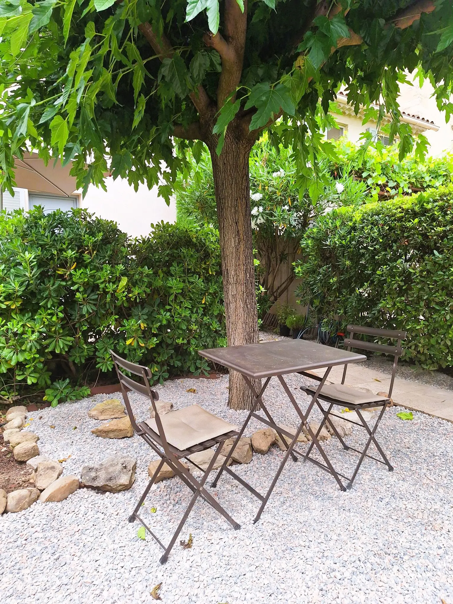 Zwei private Terrassen, eine an der Vorderseite und eine an der Rückseite des Hauses, jeweils mit Gartentisch und Sonnenschirm.