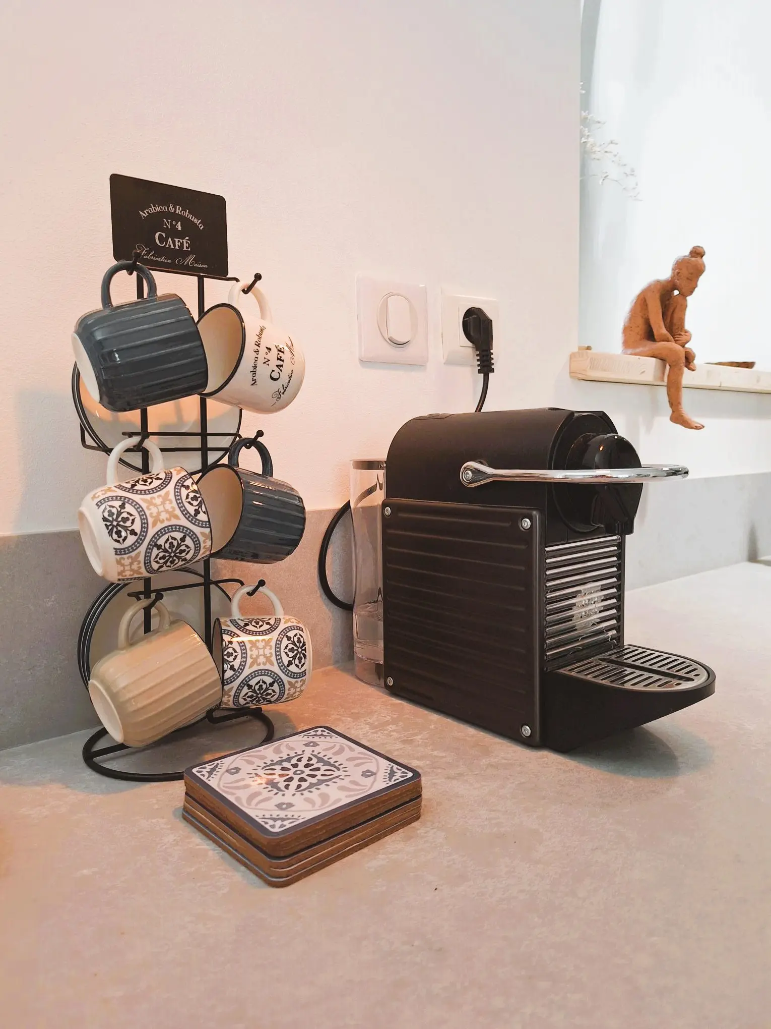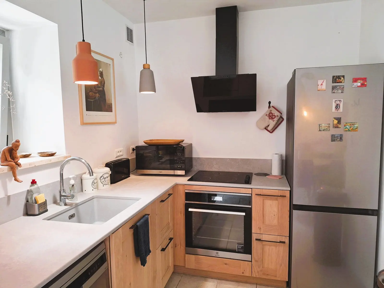 Voll ausgestattete offene Küche mit Kühlschrank mit Gefrierfach, Cerankochfeld, Backofen, Mikrowelle, Geschirrspüler, Kapselkaffeemaschine (Nespresso).