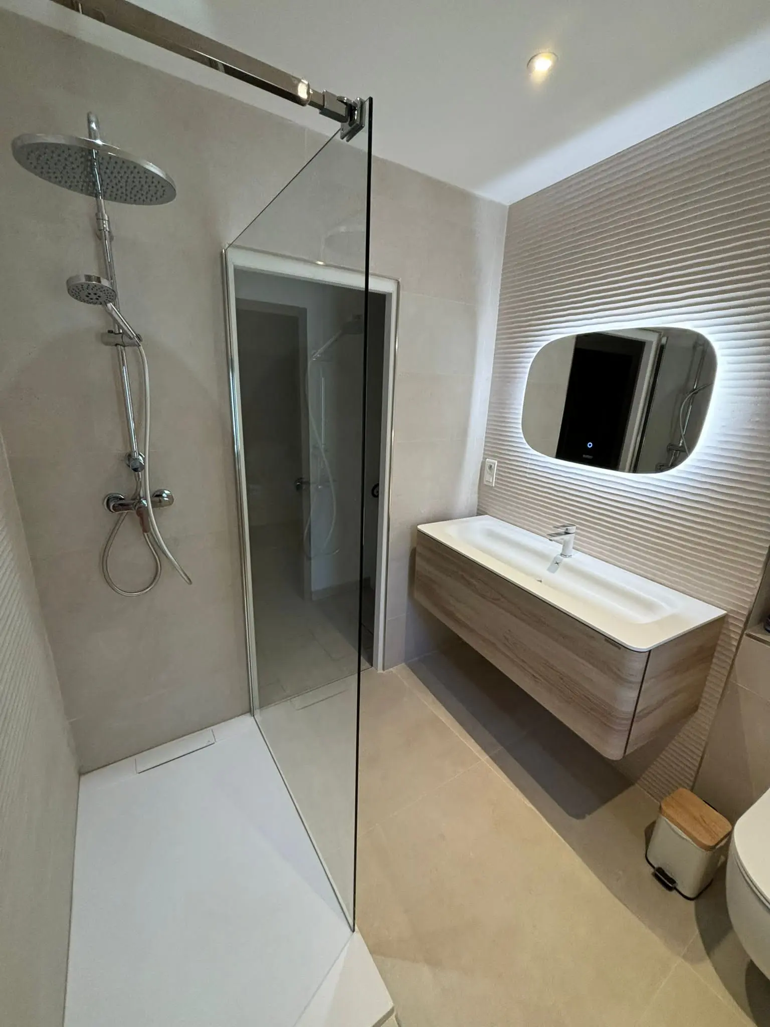Badezimmer: Waschbecken, Dusche/Badewanne und Toilette