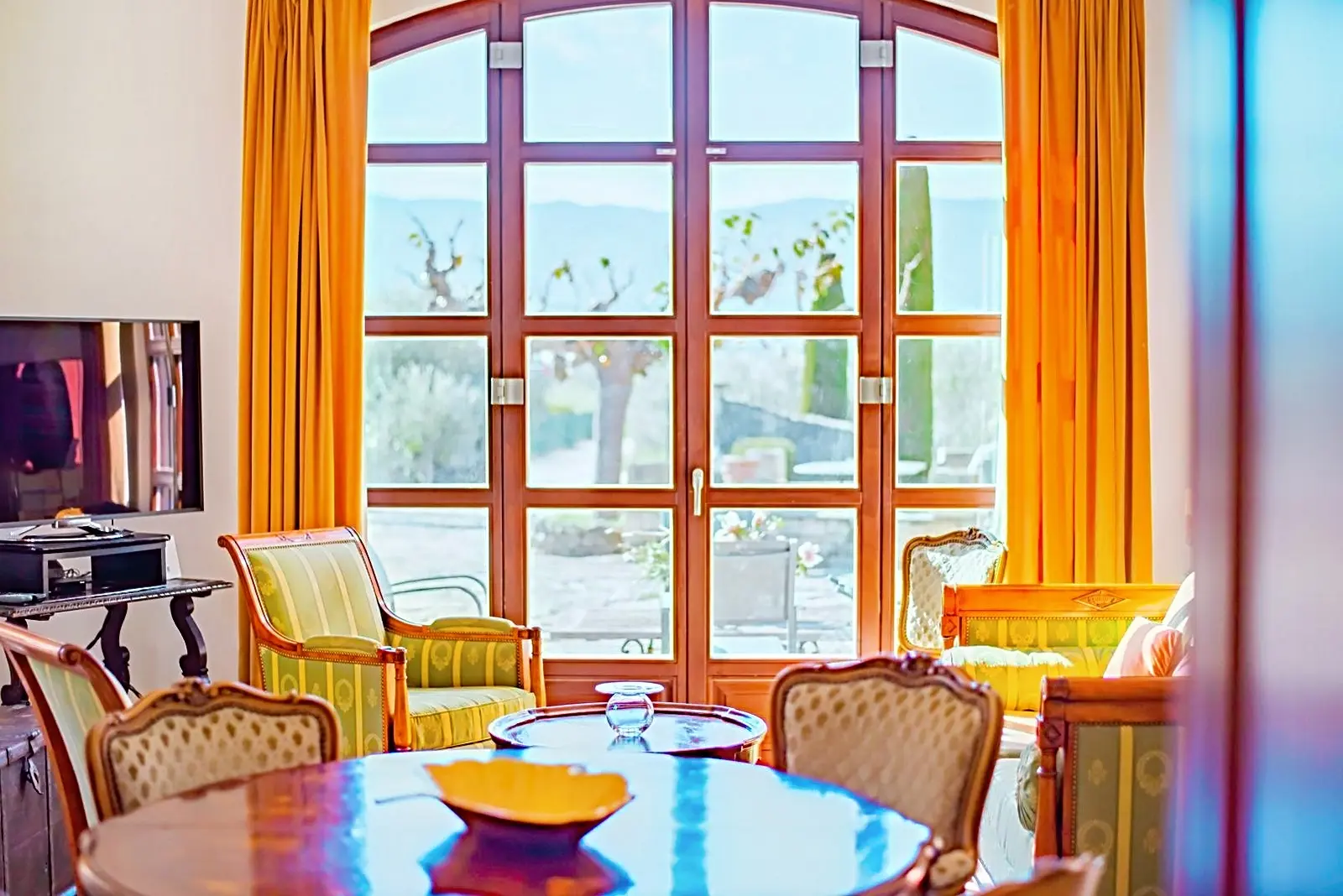 - Wohnzimmer mit Sofa, Sesseln, Fernseher (mit Canal+-Zugang und Streaming-Funktion) und viel Tageslicht mit Blick auf das Tal