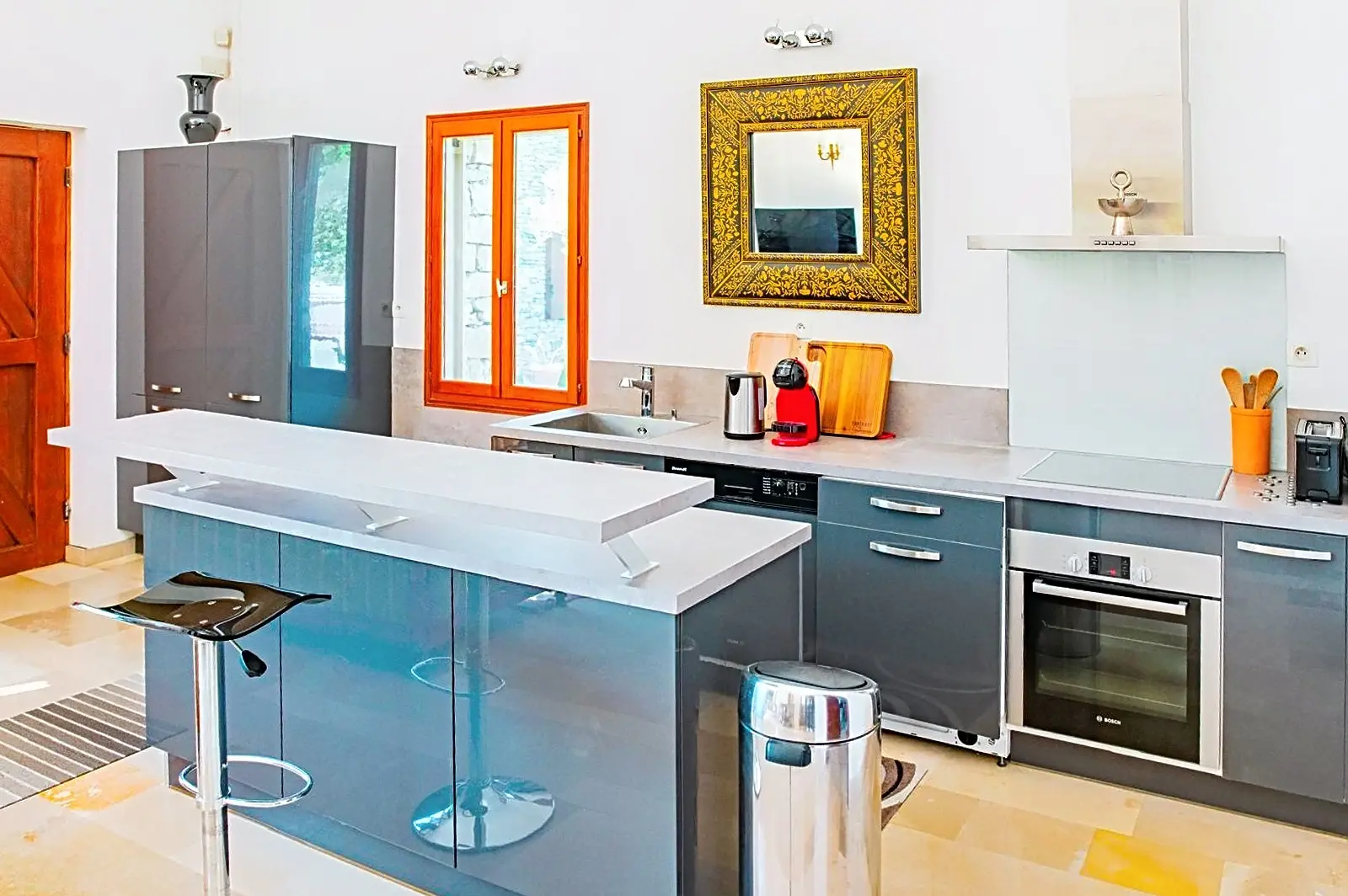 - Haushaltsgeräte: Kochfeld, Backofen, Mikrowelle, Kühl-/Gefrierkombination, Geschirrspüler, Kaffeemaschine, Wasserkocher…
