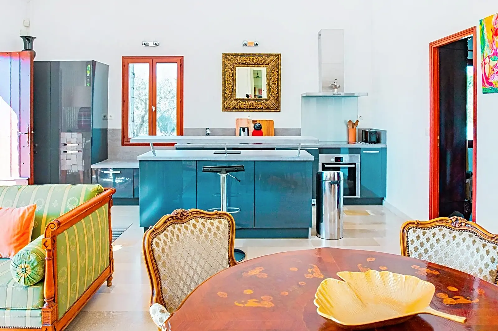 Die offene und voll ausgestattete Küche fügt sich perfekt in den Wohnbereich ein.