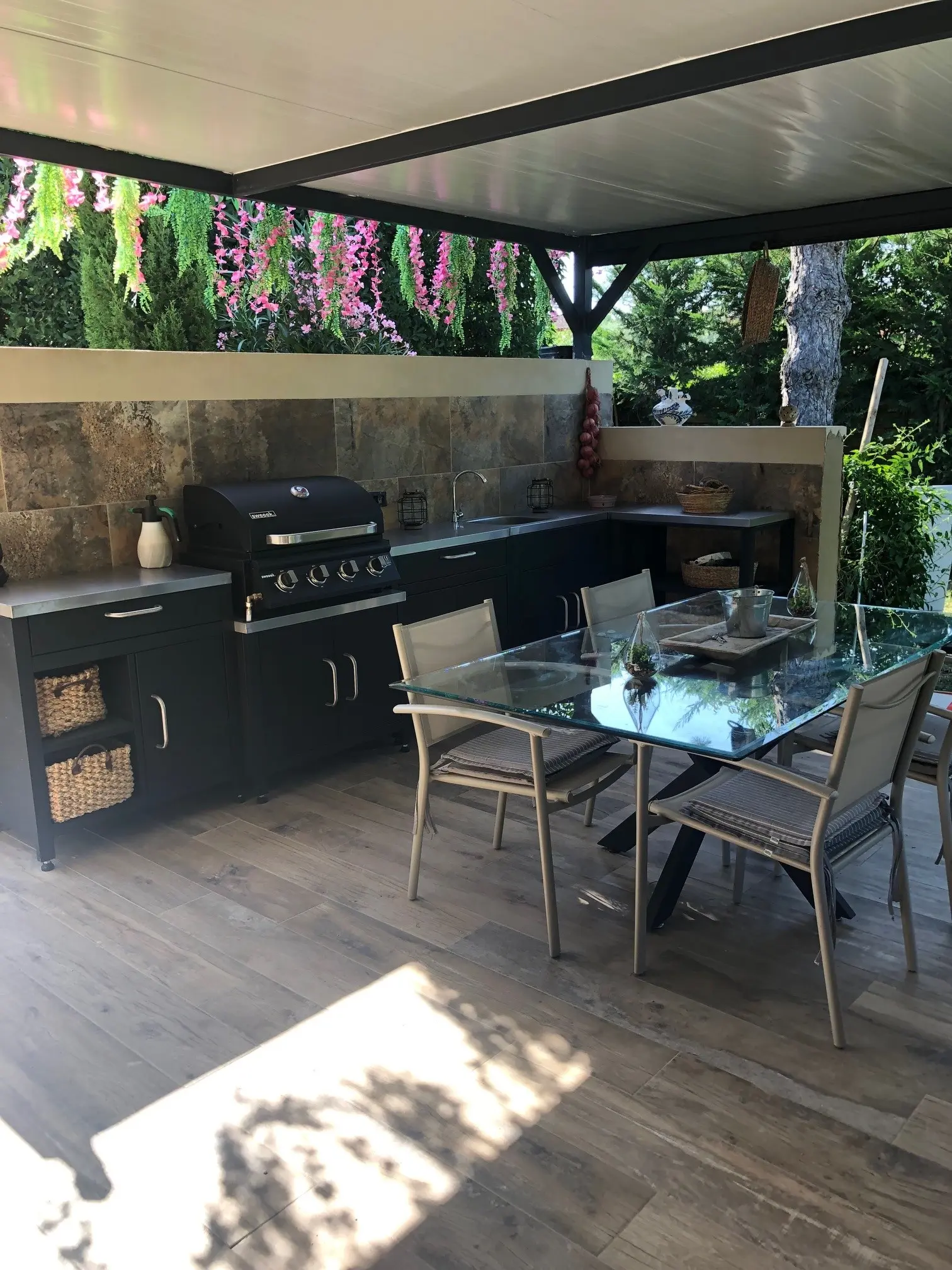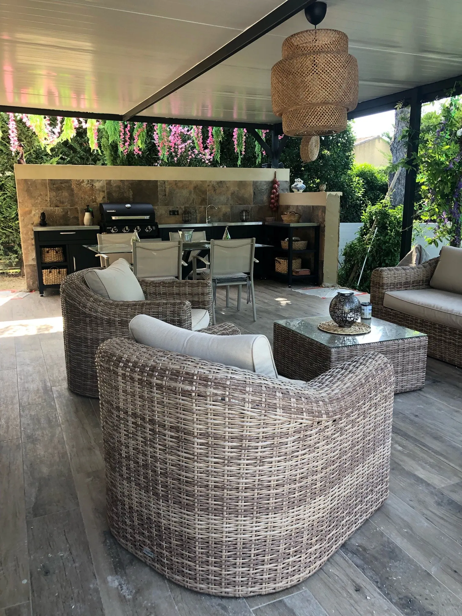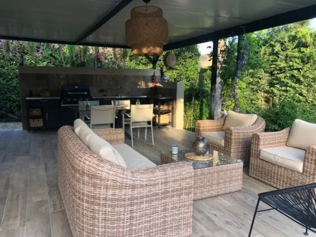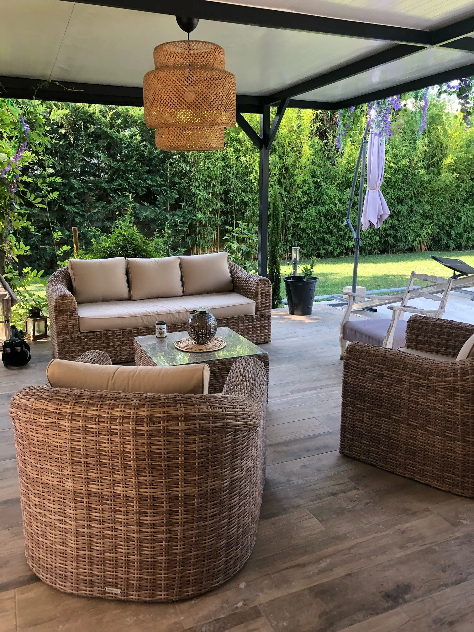 Privates Grundstück von 1000 m² mit angelegtem Garten und zwei Terrassen, von denen eine mit einer Pergola überdacht und mit einem Loungebereich ausgestattet ist.