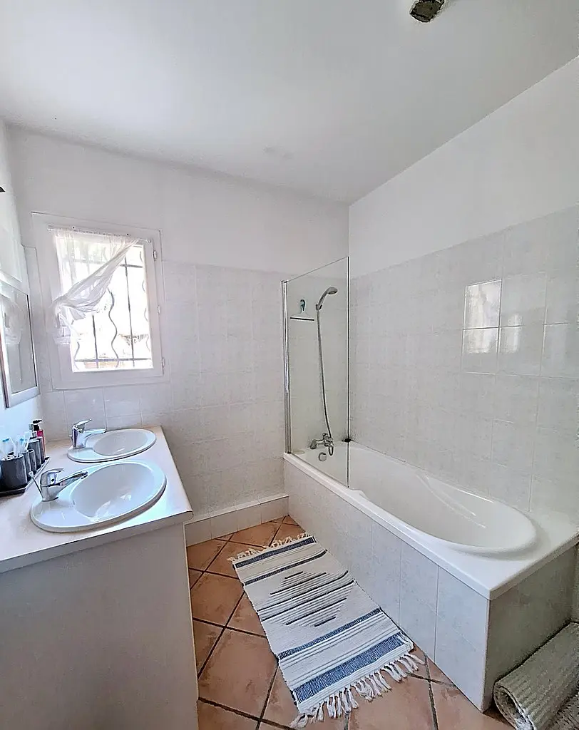 Badezimmer mit Doppelwaschbecken und Badewanne/Dusche
