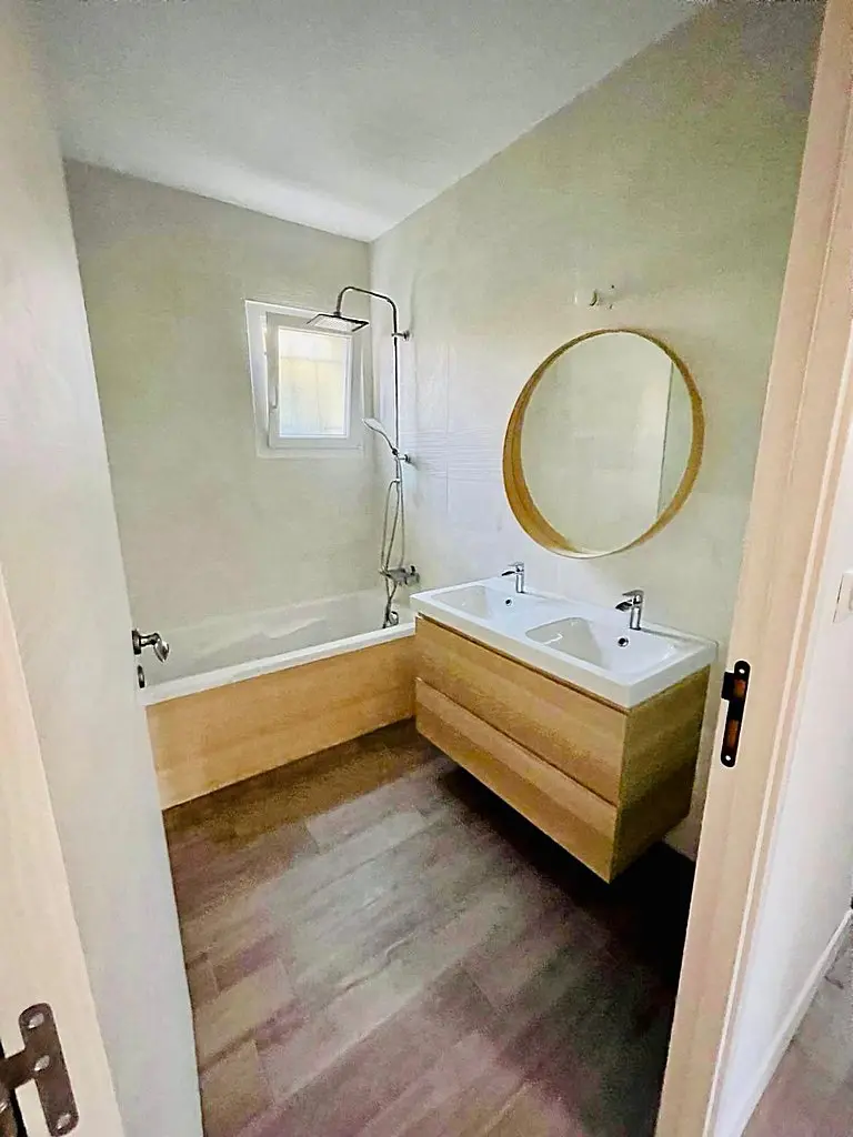 * Badezimmer 2 mit Doppelwaschbecken, Badewanne/Dusche und Stauraum