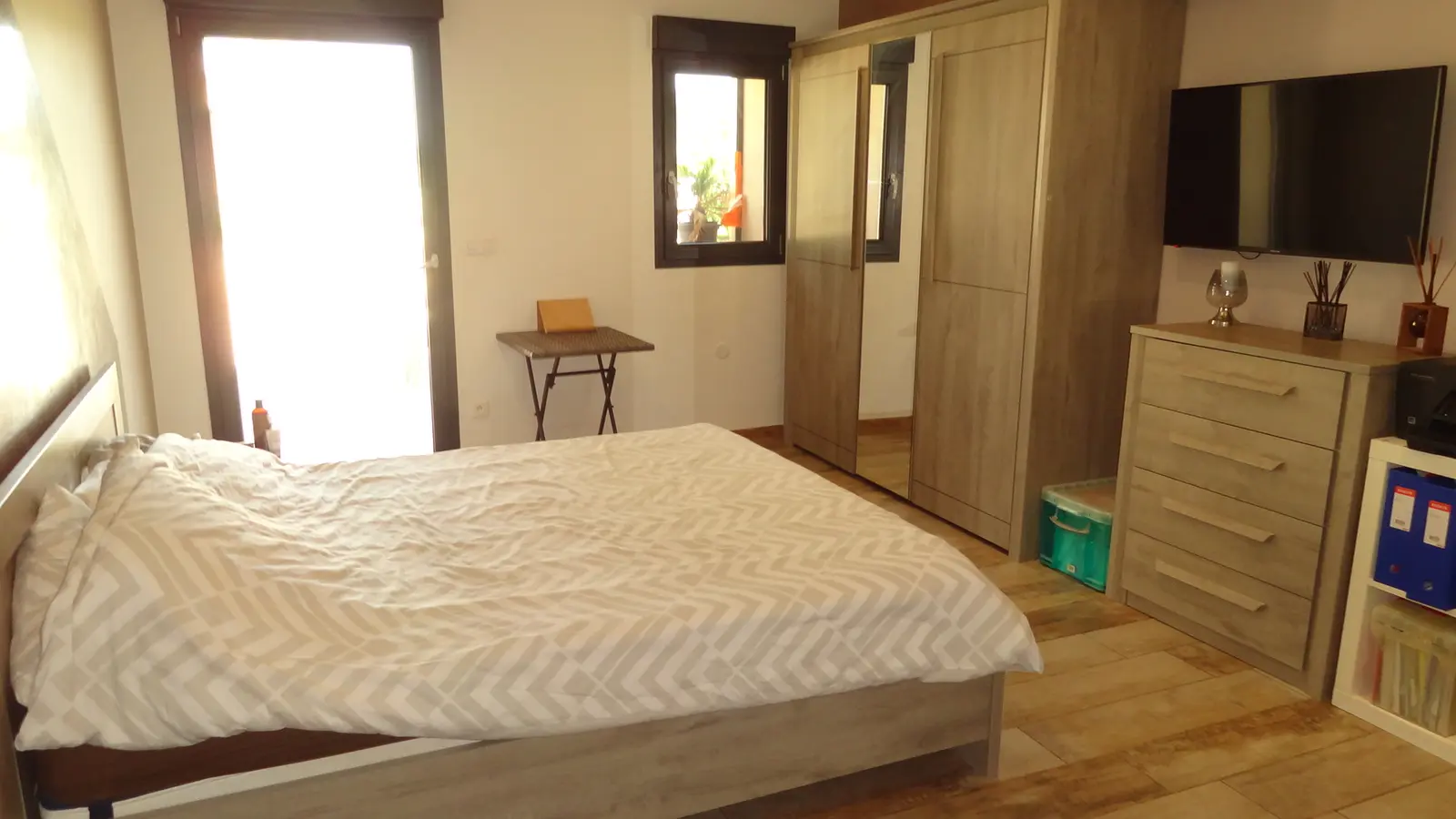 Schlafzimmer 1 (Mastersuite) mit Terrassenzugang und großem Doppelbett 160x200, Schrank, TV, eigenem Bad (mit 1 Waschbecken, 1 Badewanne, 1 Dusche)