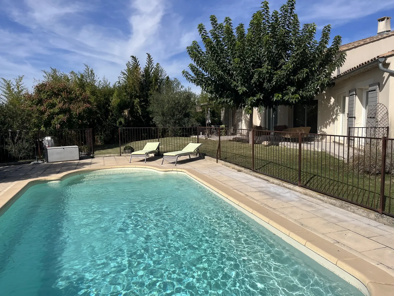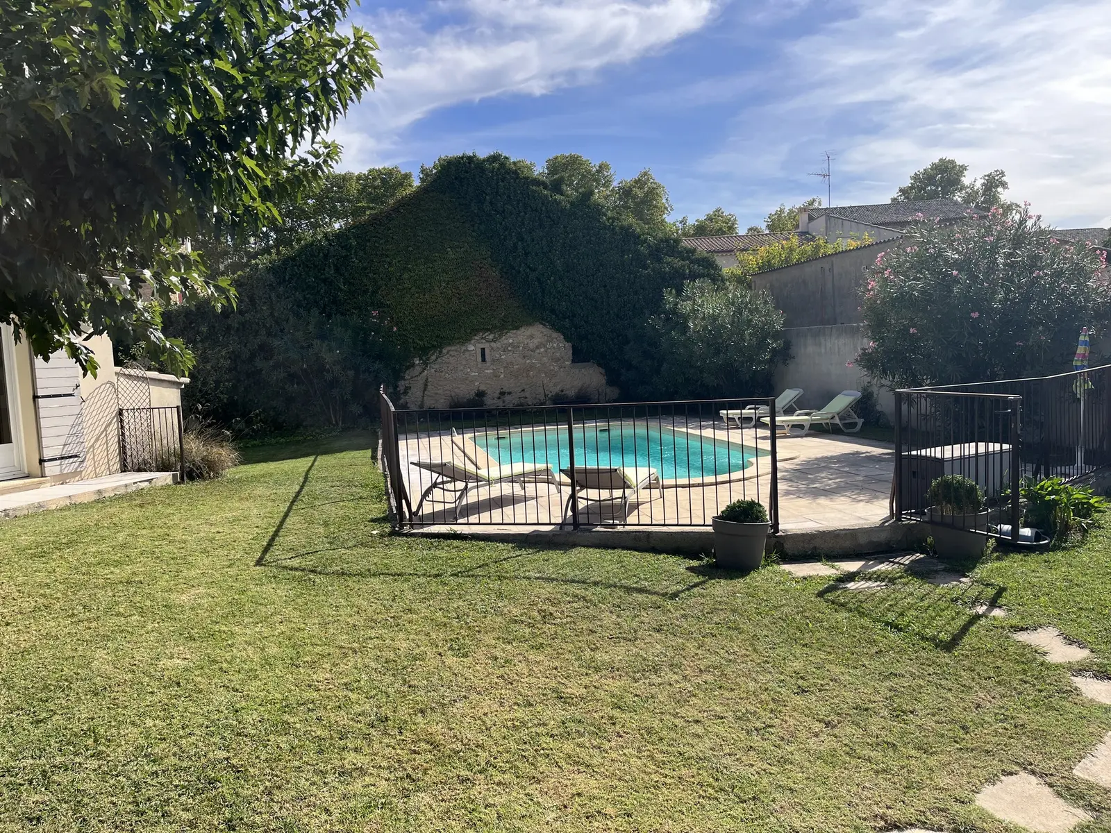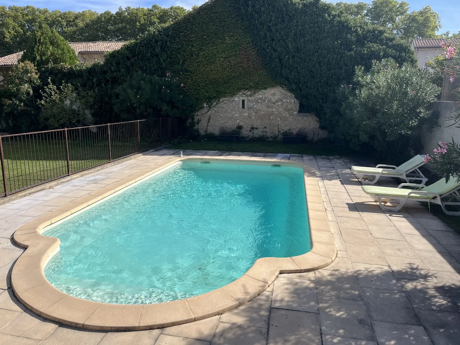 Schwimmbecken mit den Maßen 8 m x 4 m (Tiefe 1,1 bis 1,8 m) und schmiedeeisernen Absperrungen, die den Sicherheitsstandards entsprechen, um maximale Sicherheit zu gewährleisten. Poolterrasse von 75 m²
