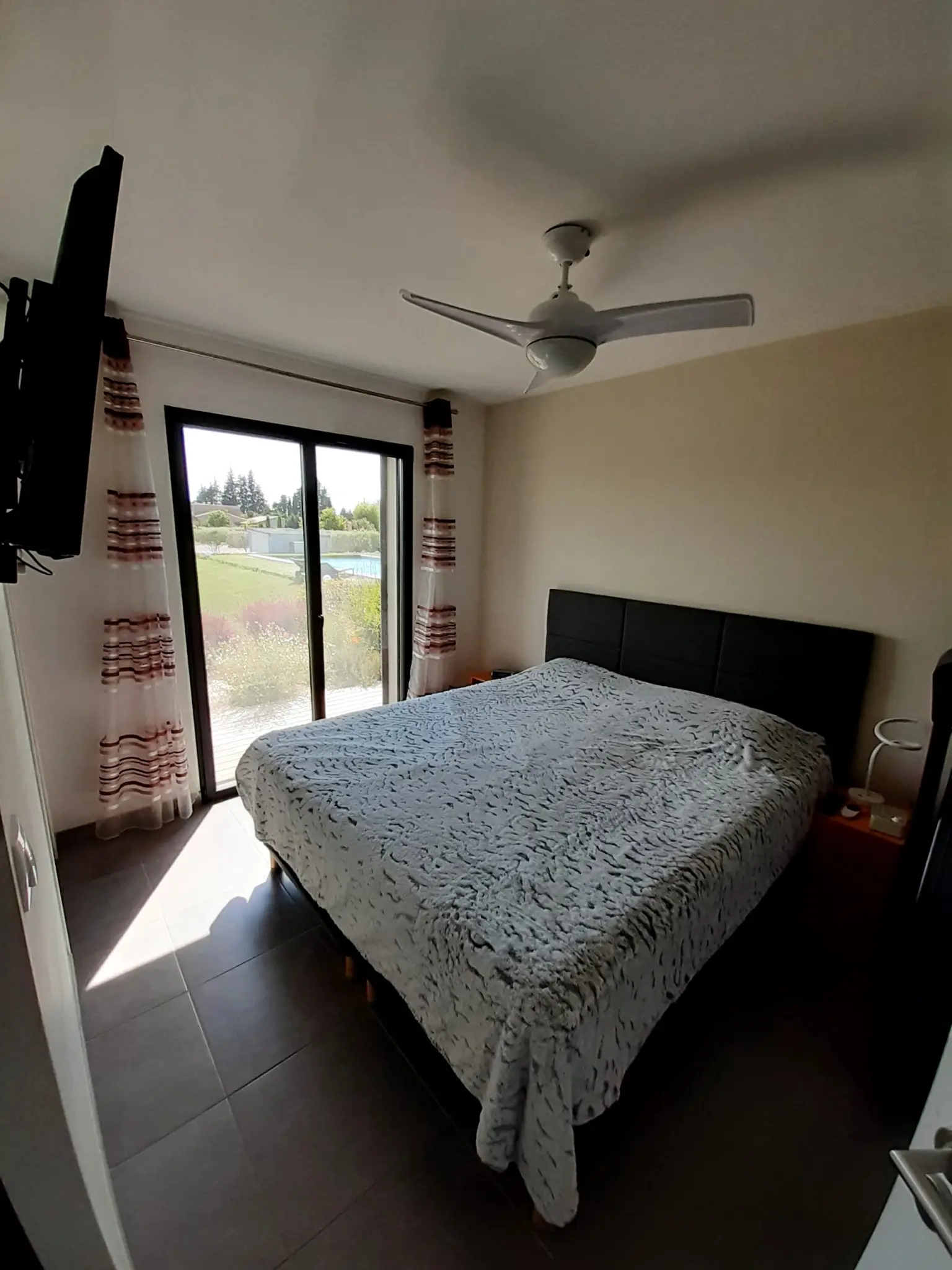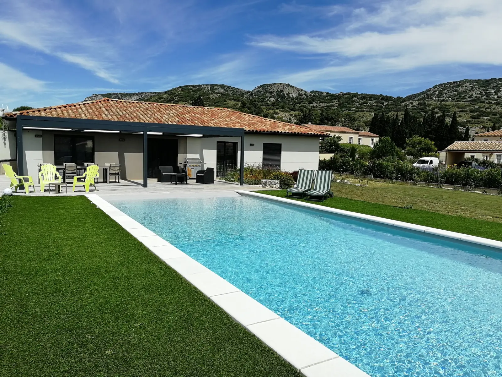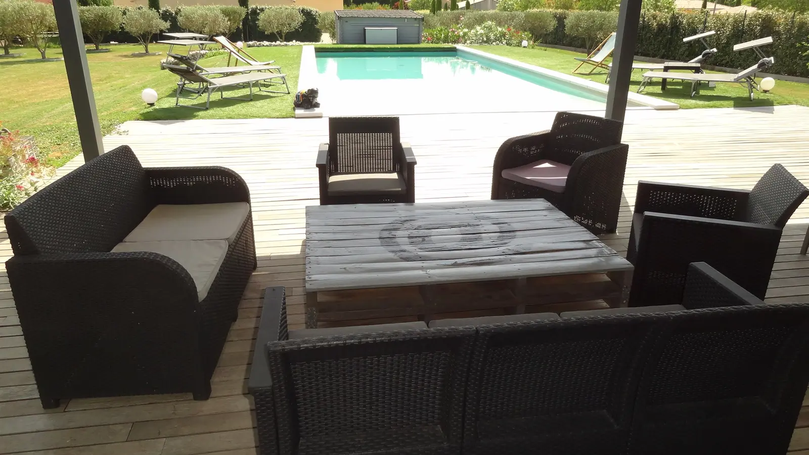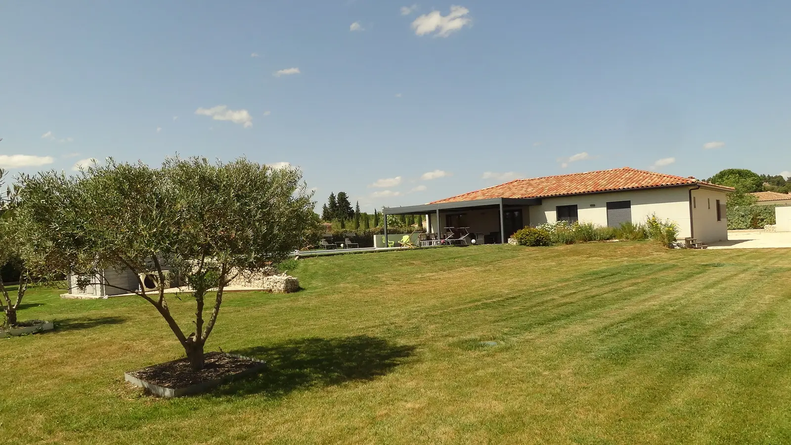 At the foot of the LUBERON, very pleasant single-story villa of approximately 160 m² with a beautiful private swimming pool of 12m x 5m on a large wooded and landscaped plot of 2500 m²; This beautiful, completely independent villa is designed to comfortably accommodate up to 8 people and has 4 bedrooms, 2 bathrooms, a living/dining room, a fully equipped American kitchen; It has a cooling floor and air conditioning in the living room.