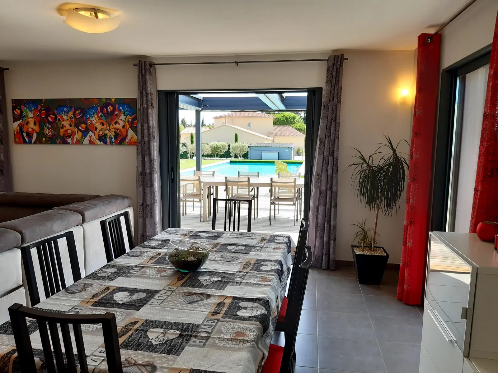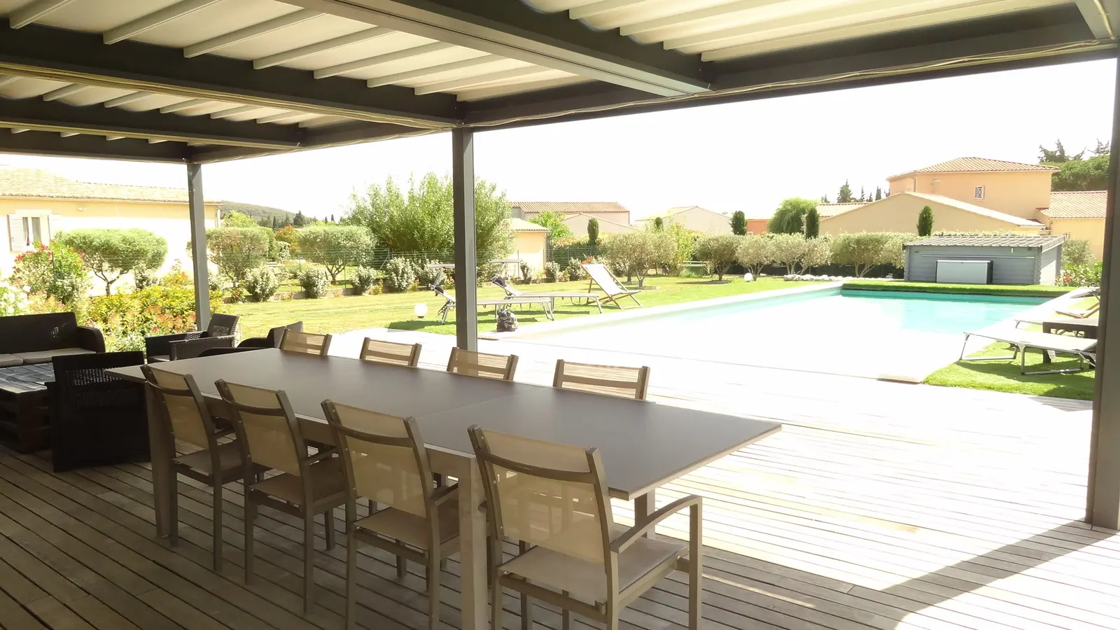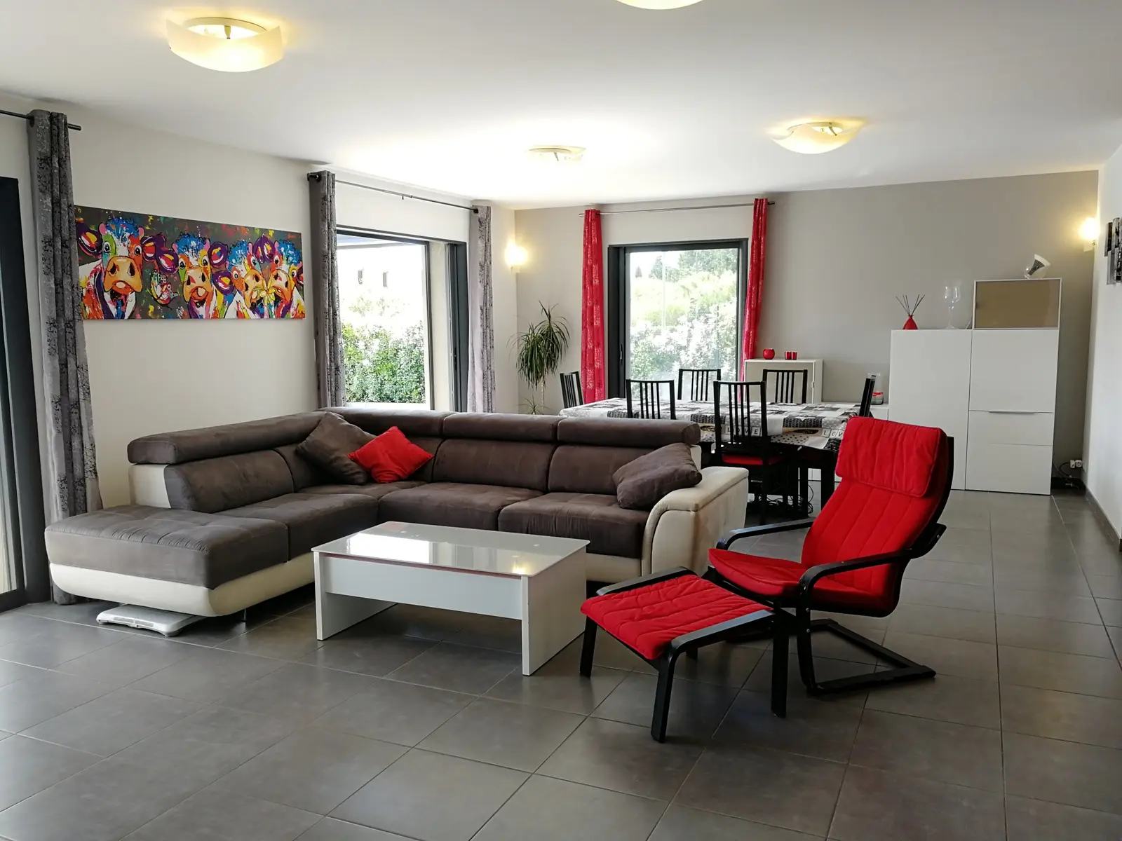 At the foot of the LUBERON, very pleasant single-story villa of approximately 160 m² with a beautiful private swimming pool of 12m x 5m on a large wooded and landscaped plot of 2500 m²; This beautiful, completely independent villa is designed to comfortably accommodate up to 8 people and has 4 bedrooms, 2 bathrooms, a living/dining room, a fully equipped American kitchen; It has a cooling floor and air conditioning in the living room.