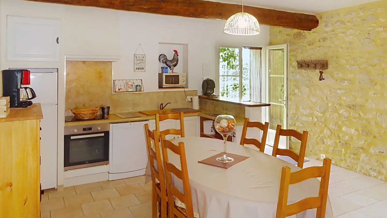 - Electroménager : Réfrigérateur/congélateur, lave-vaisselle, four micro-onde, lave-linge ;1 grille-pain,1 cafetière, plaque de cuisson vitrocéramique, lave linge