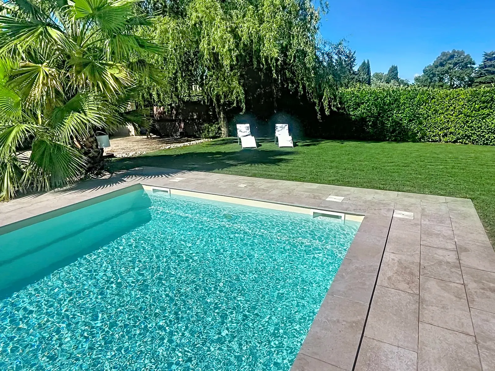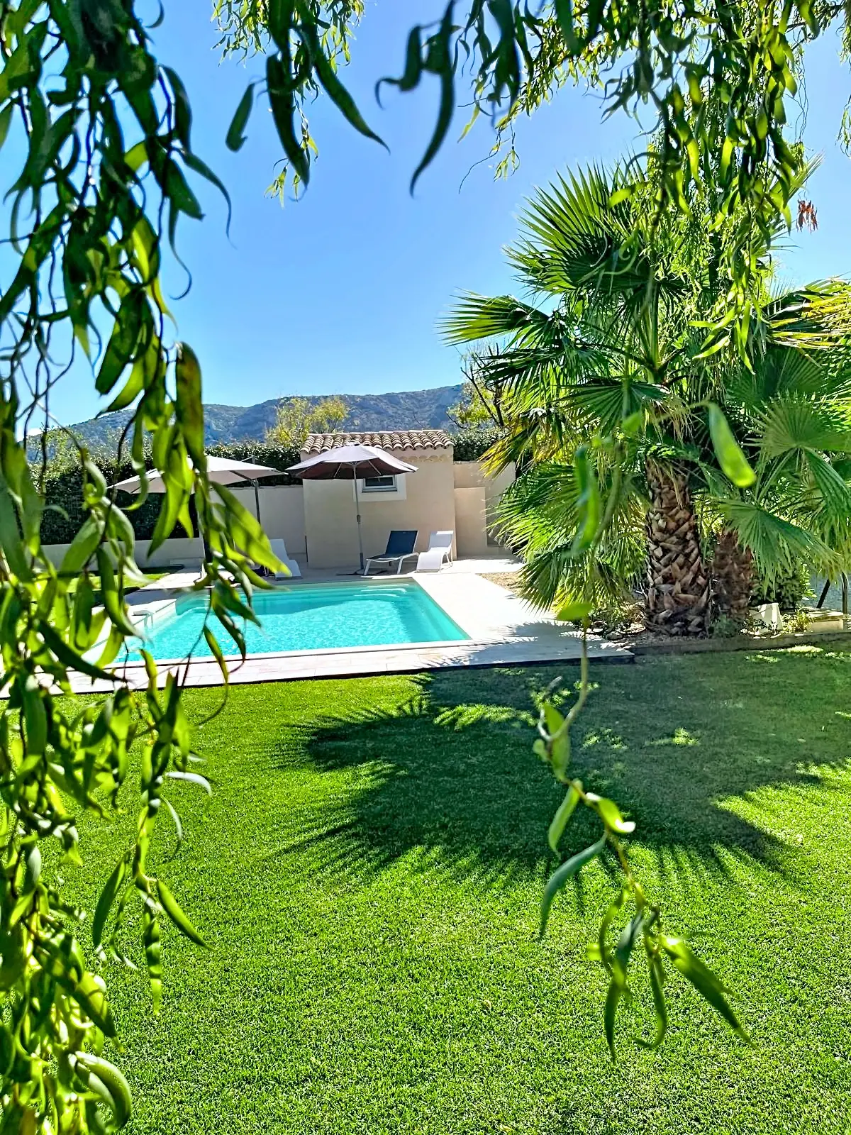 En extérieur son terrain de 1000 m² entièrement clos vous offre une agréable terrasse ombragée de verdure et un très beau jardin très arboré et parfaitement entretenu agrémenté d'une belle piscine privative de 8mx4m entourée d’une belle pelouse verdoyante et une vue magnifique sur le massif du Lubéron.