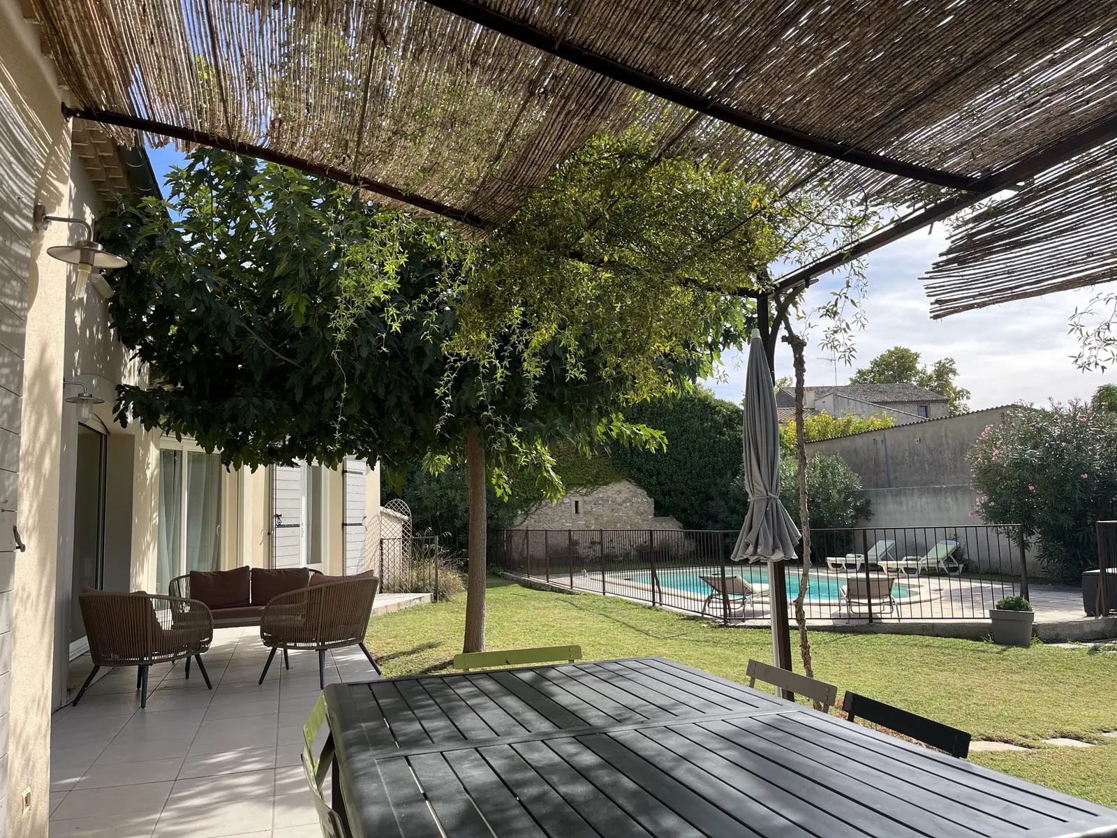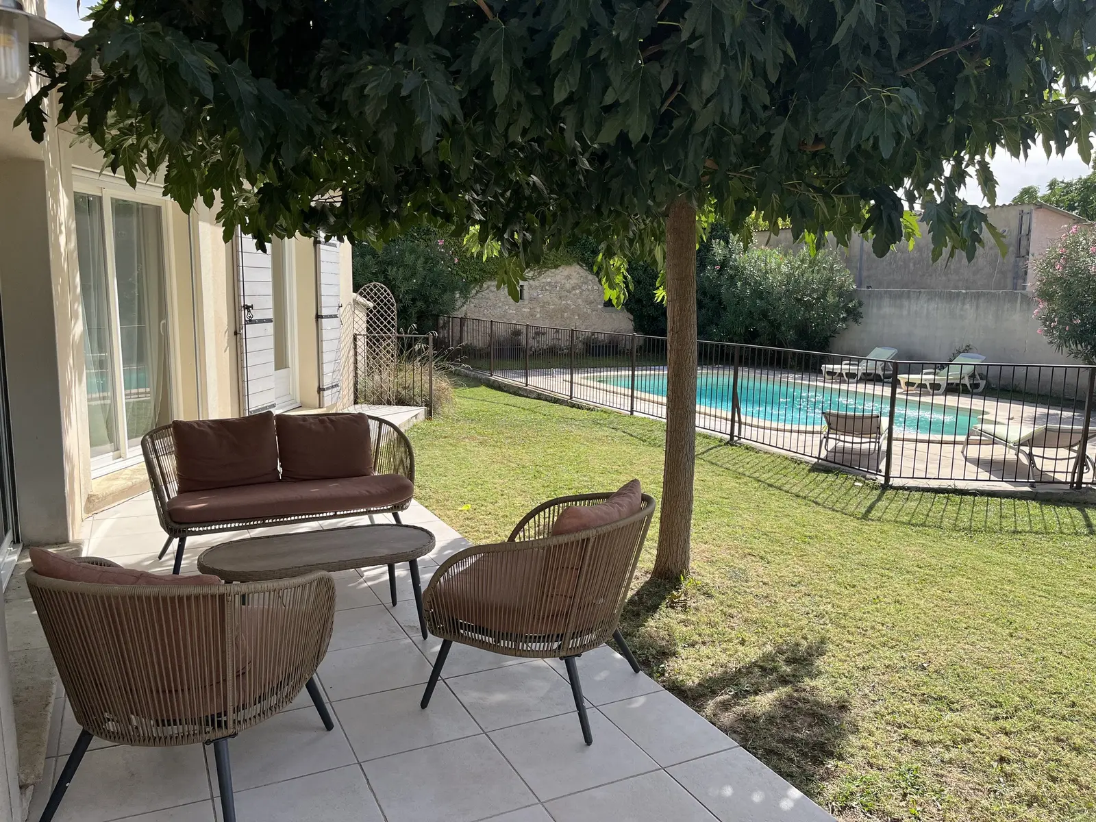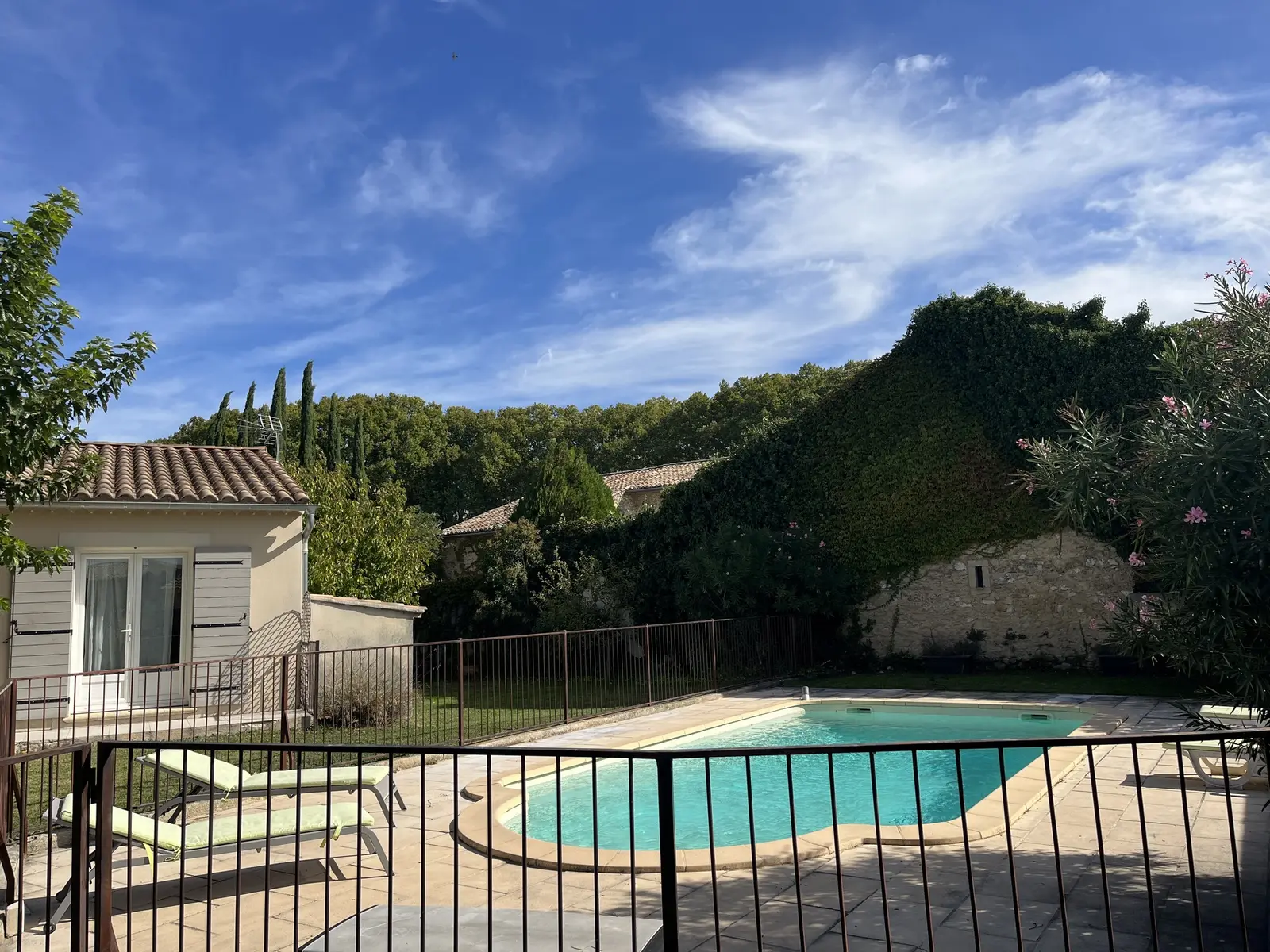 Piscine de 8mX4m (profondeur 1.1 à 1.8m) équipée de barrières en fer forgé aux normes de sécurité pour assurer une sécurité maximale. Terrasse de piscine de 75 m²