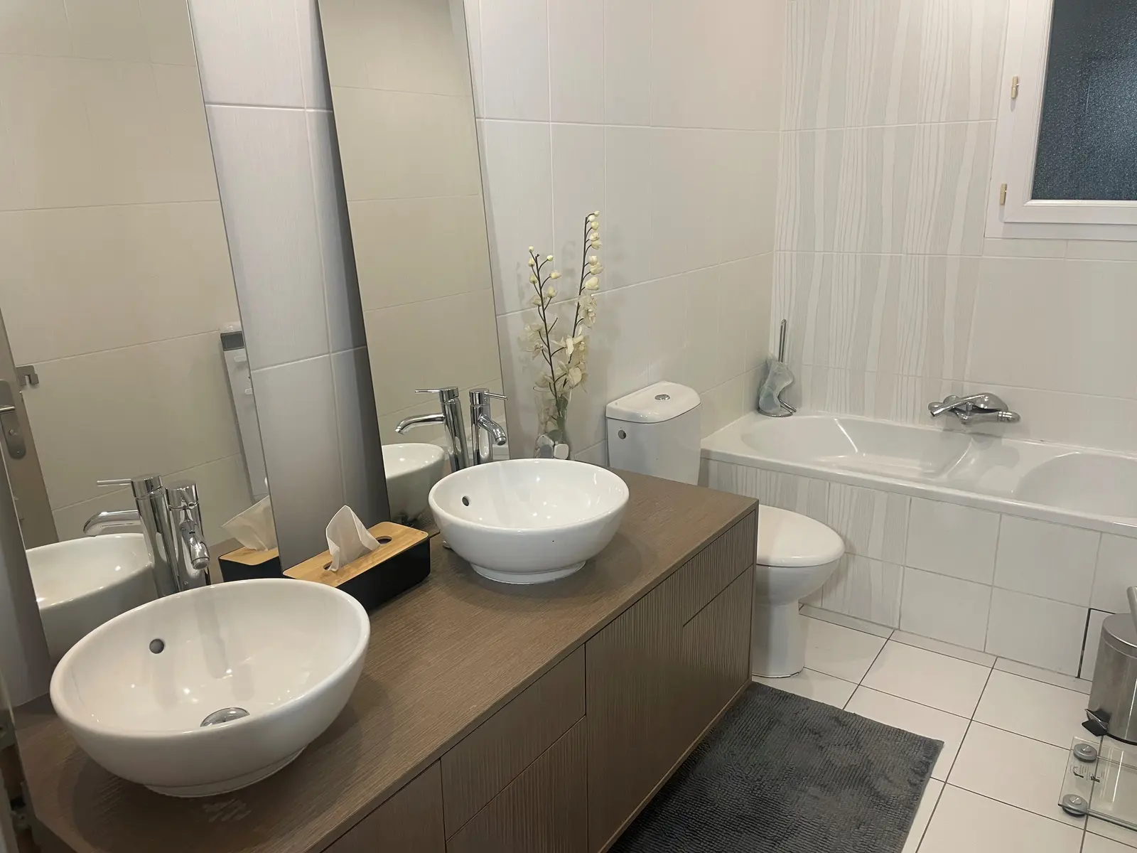 1 salle de bain avec baignoire, 2 vasques et une douche