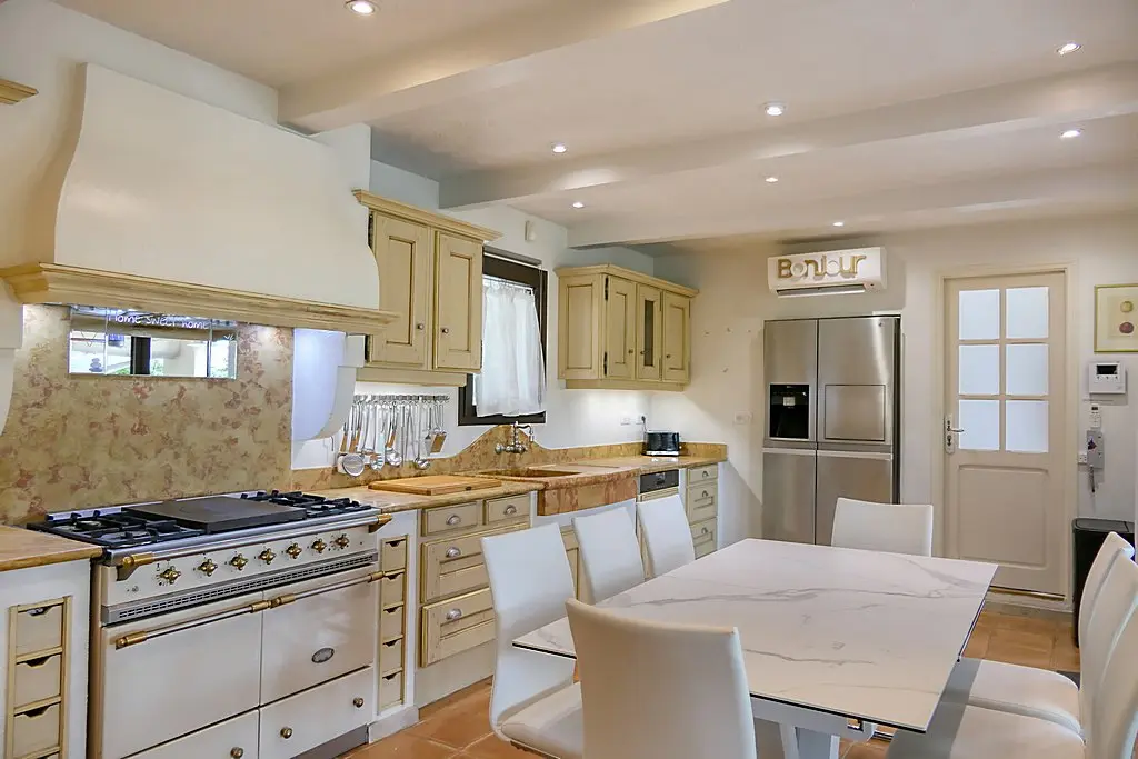 Électroménagers : Piano de cuisine (Gaz) , four, four micro-onde, cafetière Nespresso et cafetière classique, frigo américain / congélateur, deuxième frigo / congélateur dans le cellier, lave-vaisselle, Lave-linge, Sèche-linge