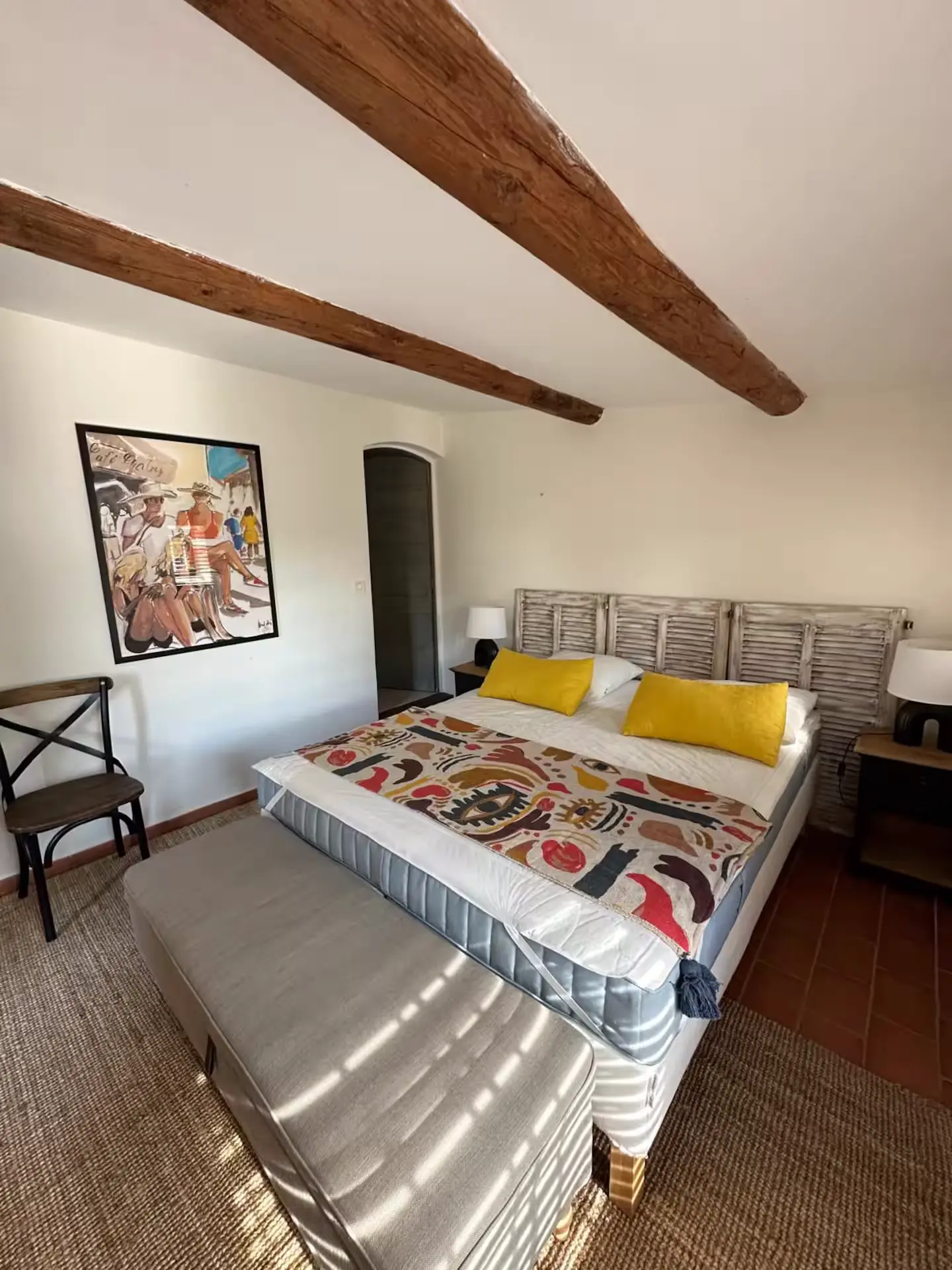 Chambre n°1 (suite) avec grand lit double en 160, rangements (armoire, placard ou penderie) et salle de bain privative (1 Vasque et 1 baignoire)