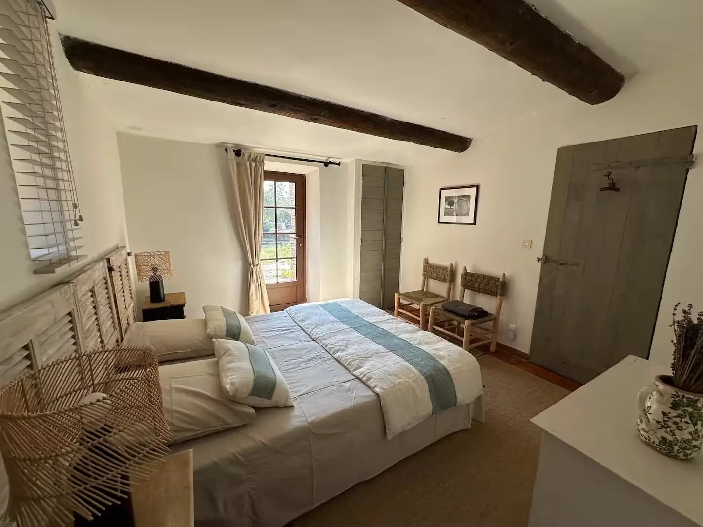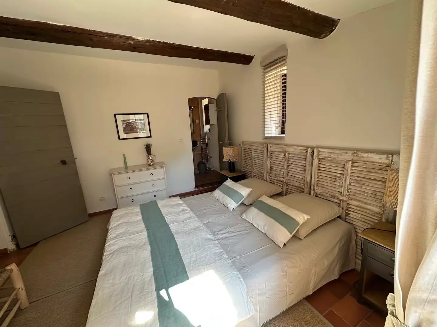 Chambre n°2 (suite) avec grand lit double en 160, rangements (armoire, placard ou penderie) et salle d’eau privative (1 Vasque et 1 douche)