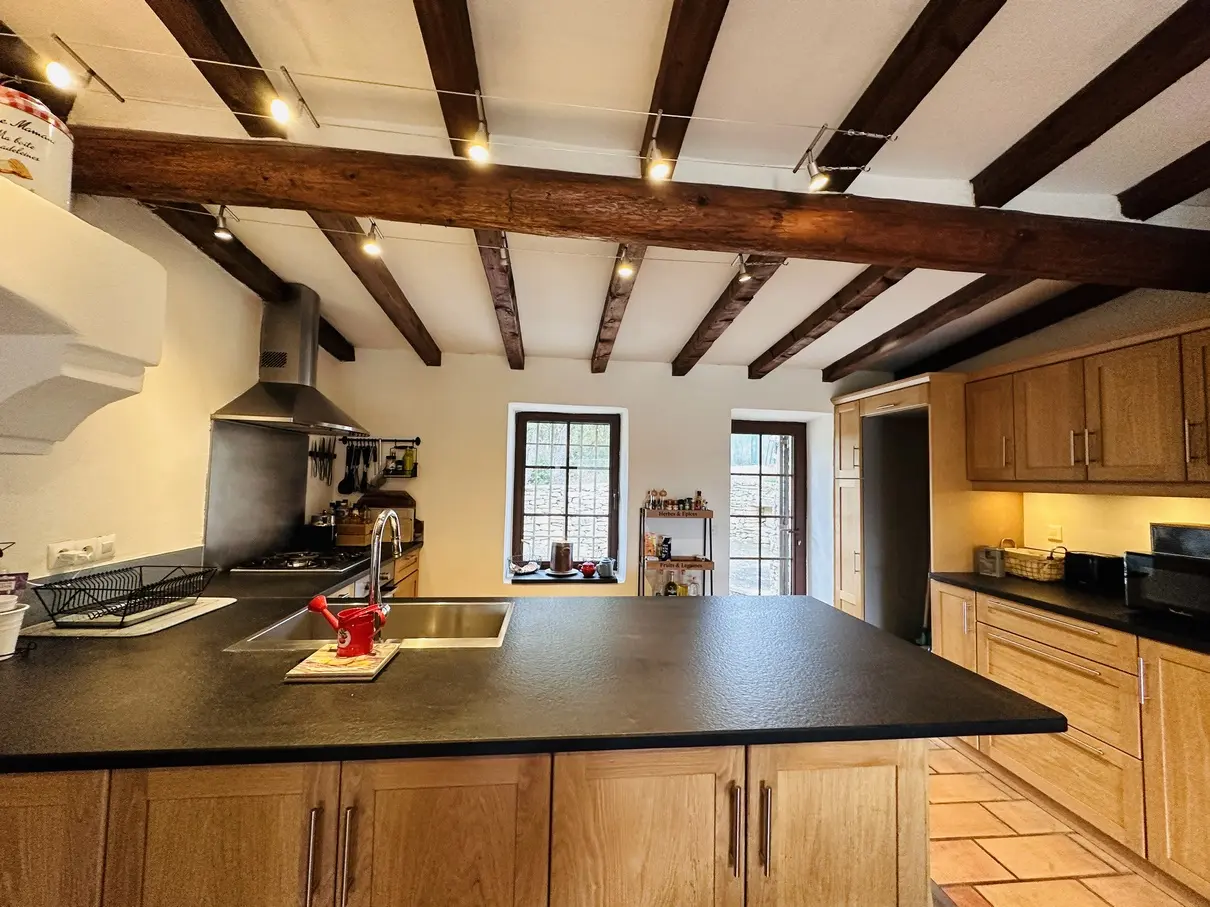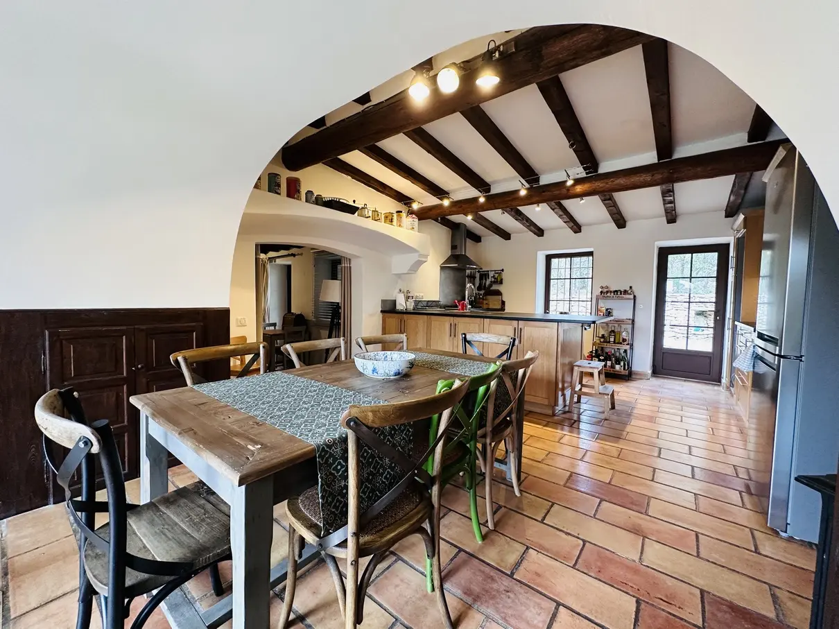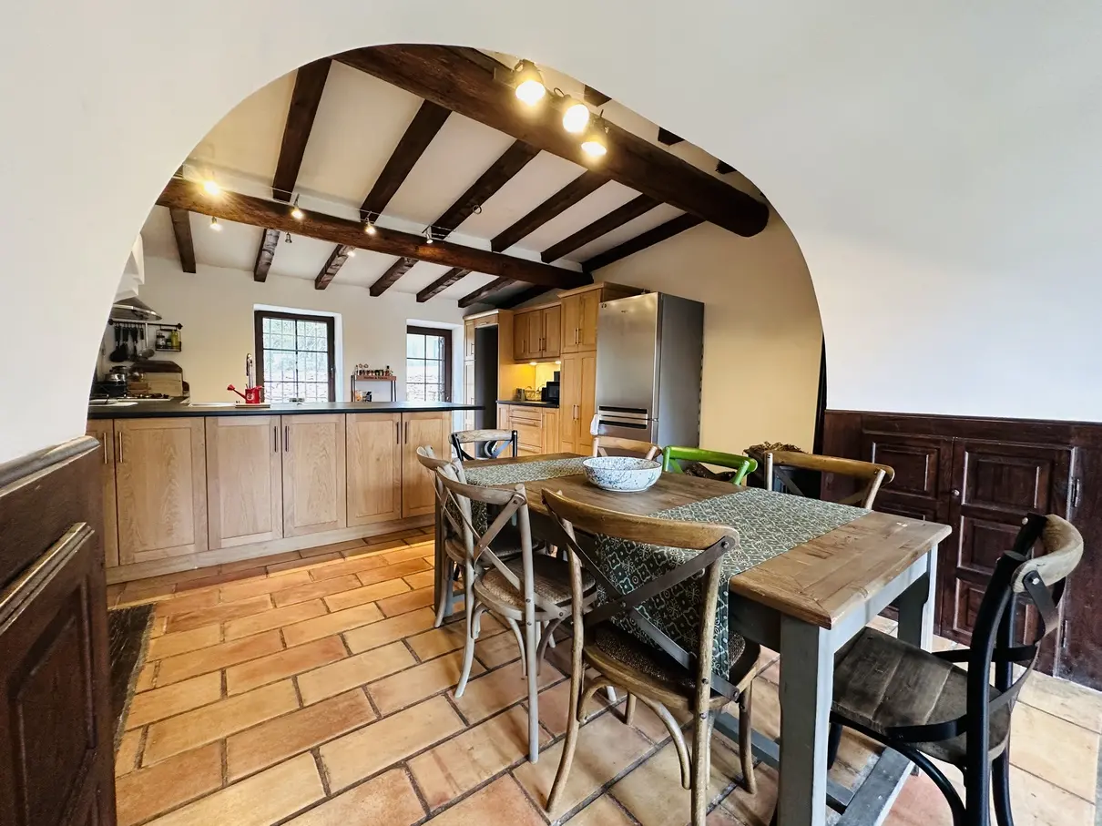 Cuisine tout équipée ouverte avec salle à manger attenante avec table et chaises
