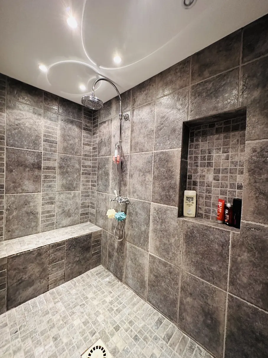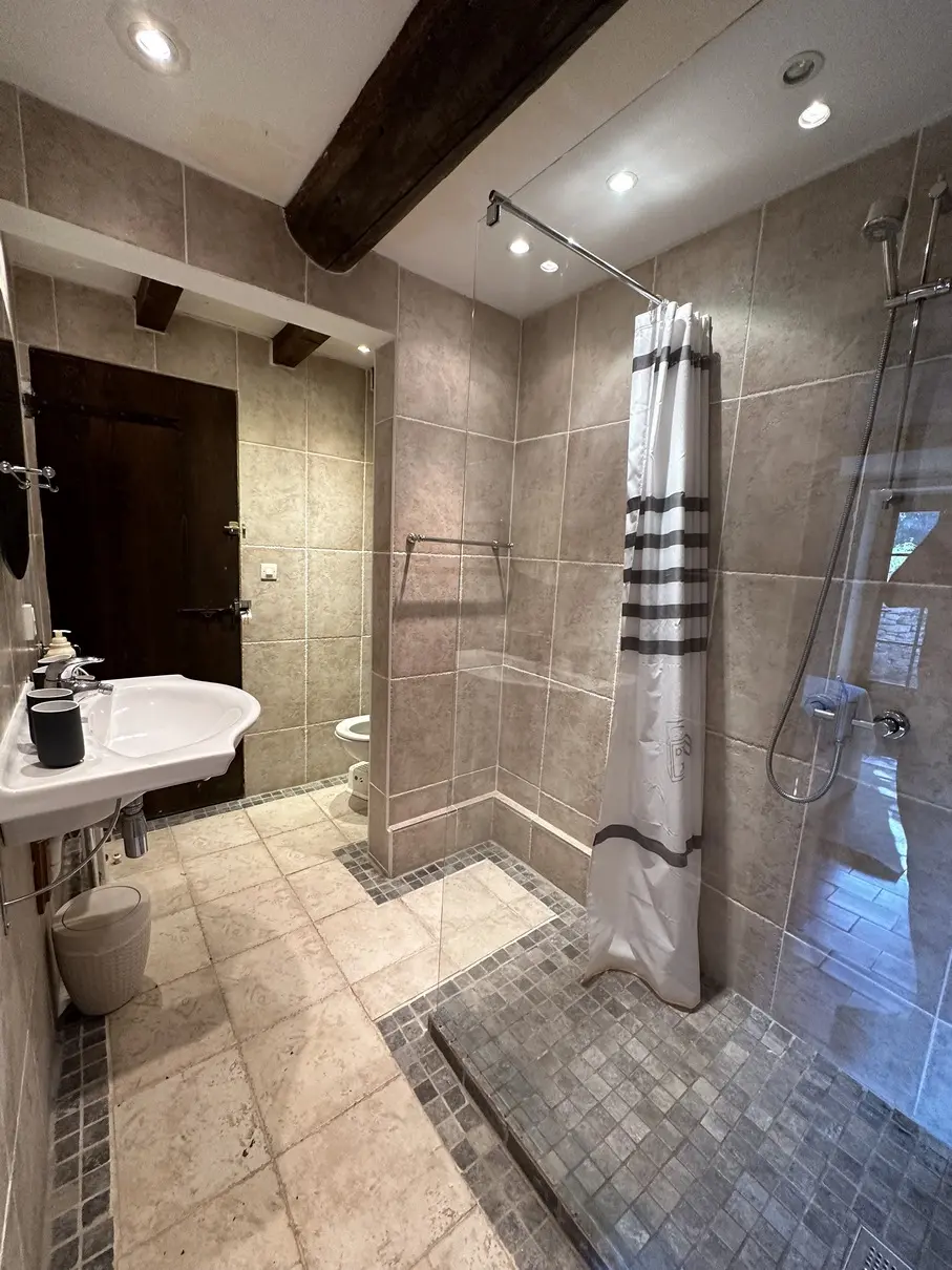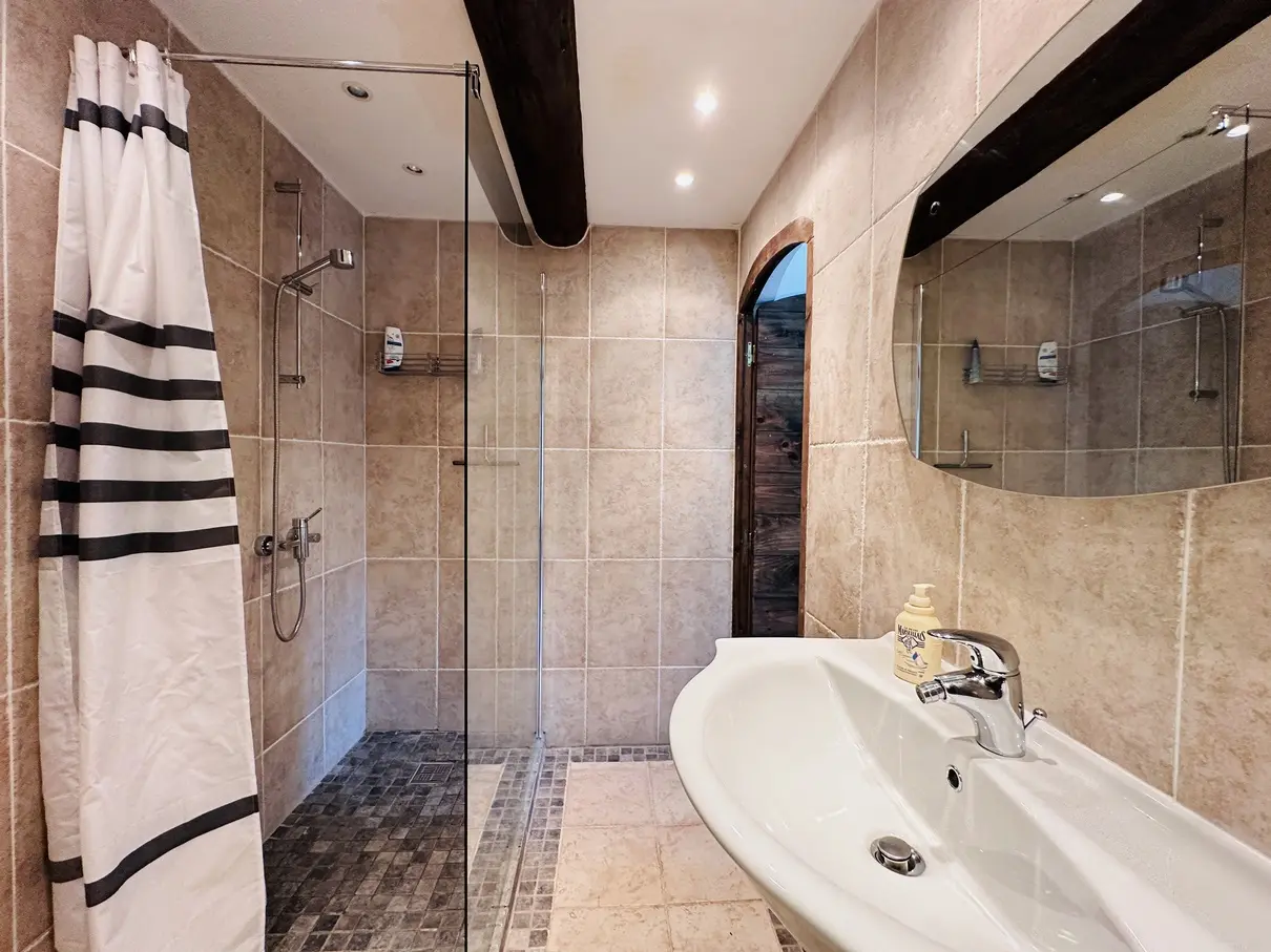 Chambre n°3 (suite) avec grand lit double en 160, rangements (armoire, placard ou penderie) et salle d’eau privative (1 Vasque, 1 douche et 1 WC)