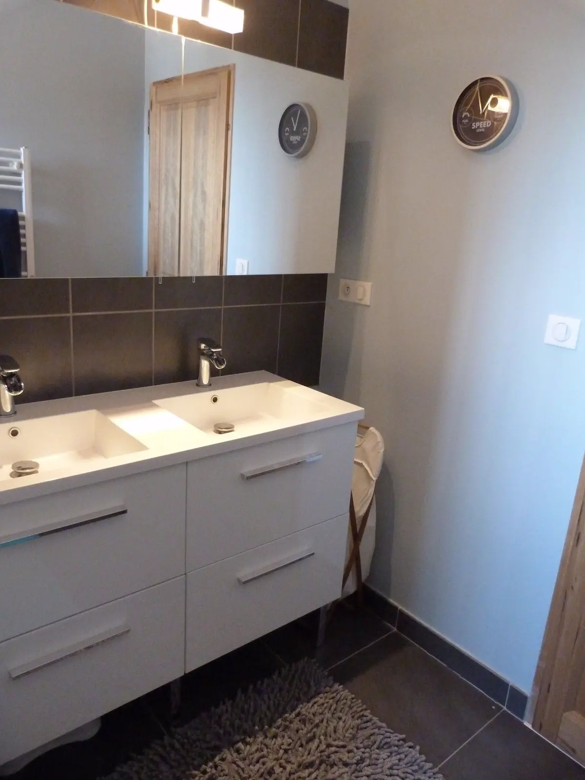 CHAMBRE 1 avec grand lit double (160) et SALLE DE BAIN (1 vasque, 1 baignoire, 1 douche)