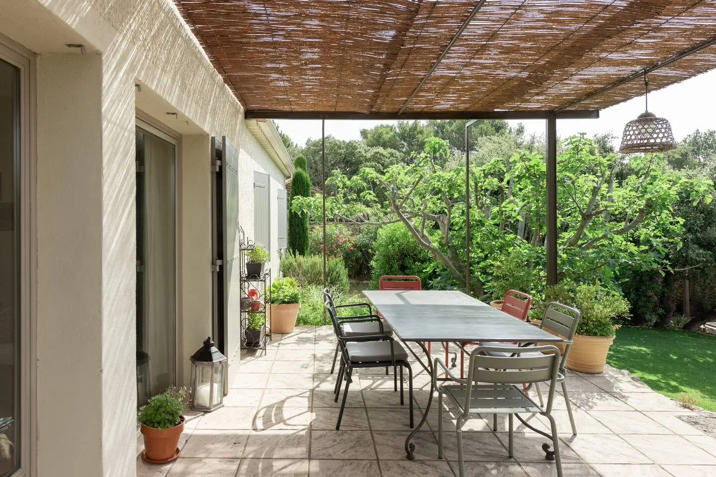 Terrassen onder prieel met buitentafel en stoelen, tuinmeubelen, ...
