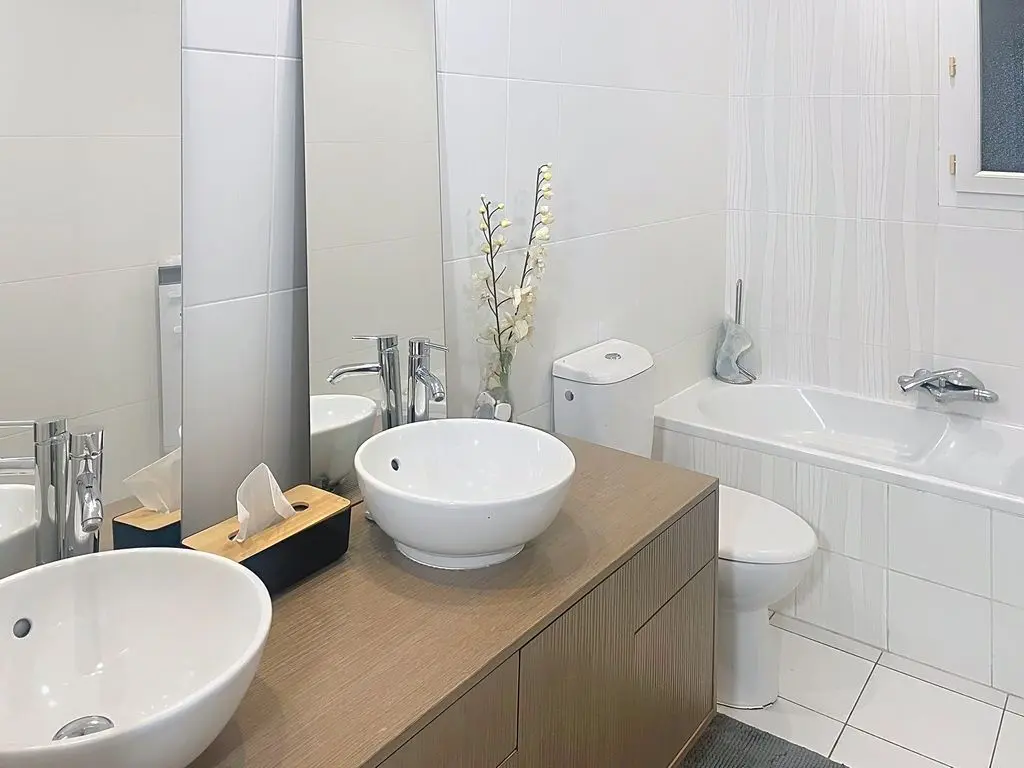 1 badkamer met ligbad, 2 wastafels en een douche.
