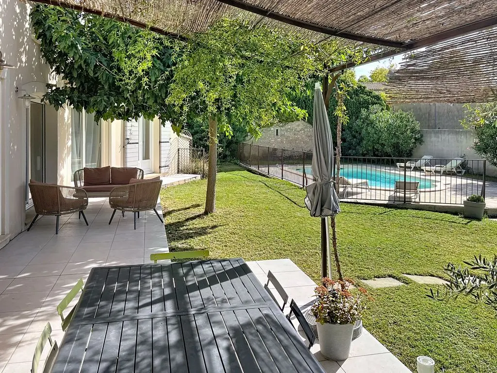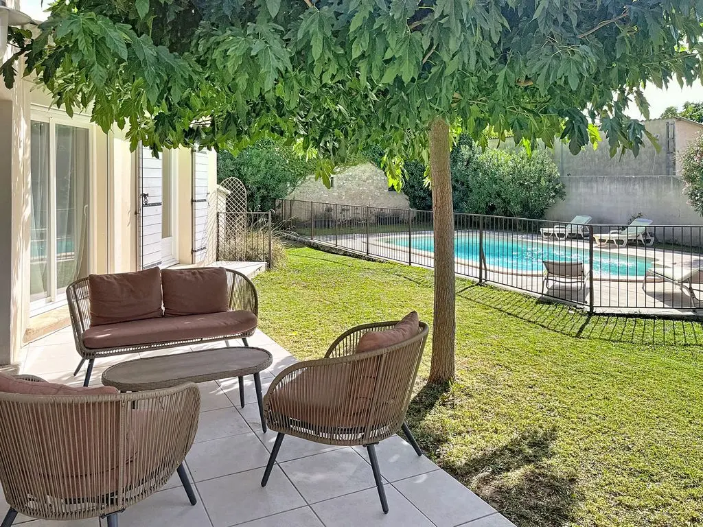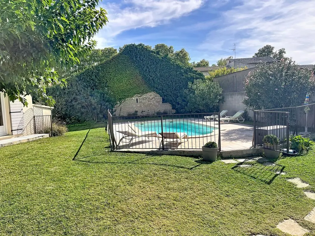 Zwembad van 8m x 4m (diepte 1,1 tot 1,8m) voorzien van smeedijzeren hekken die voldoen aan de veiligheidsnormen voor maximale veiligheid. Zwembadterras van 75 m².